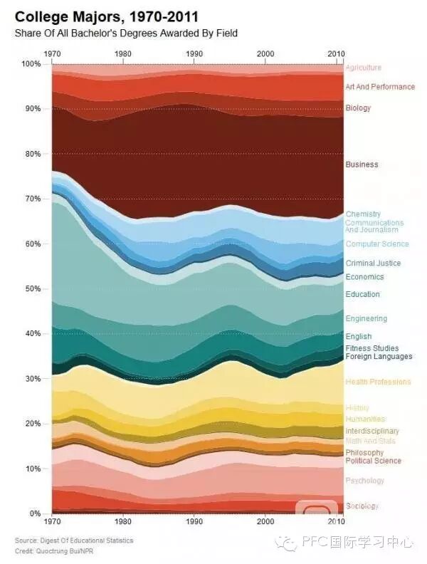 2. 教育专业的没落。1970年该专业受欢迎的程度还有21%,2011年跌到了6%。现在越来越少的教师是教育学专业毕业的了。