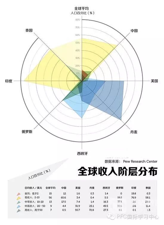 近日,皮尤研究中心根据世界银行和卢森堡收入研究数据库的数据制作了全球收入阶层分布图,在经过购买力平价换算之后,以日均收入低于2美元为贫困标准,依次划分了五个阶层,并将2001年与2011年的数据进行对比。
